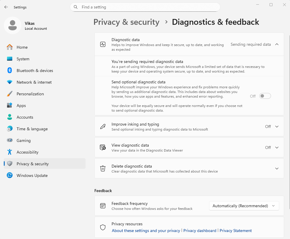 1. Settings → Privacy & security → Diagnostics & feedback.