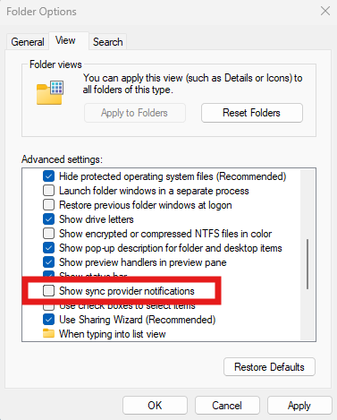 2. Go to the View tab and uncheck “Show sync provider notifications.”.
