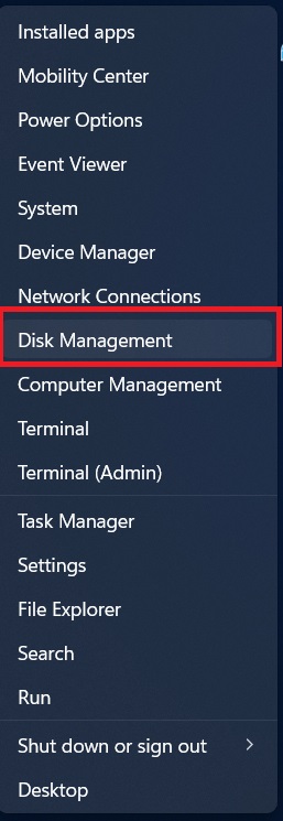 Right-click the Start button and select Disk Management.