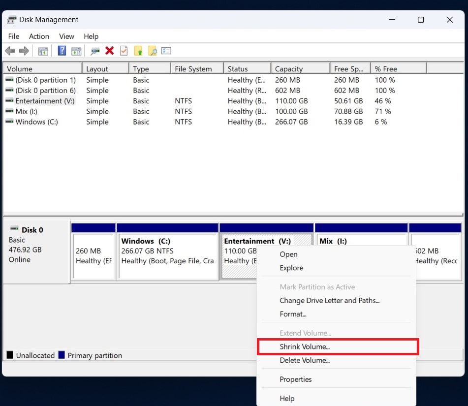Right-click the drive you want to partition and choose Shrink Volume.