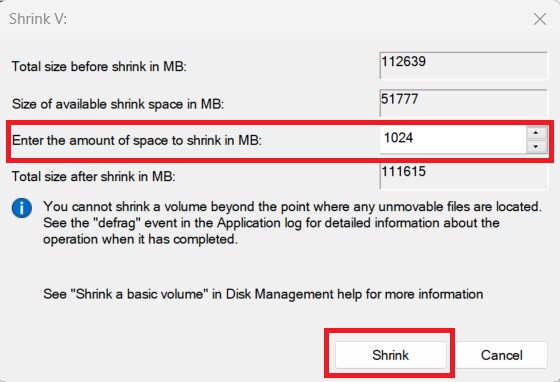 Specify the amount of space to shrink and click Shrink.