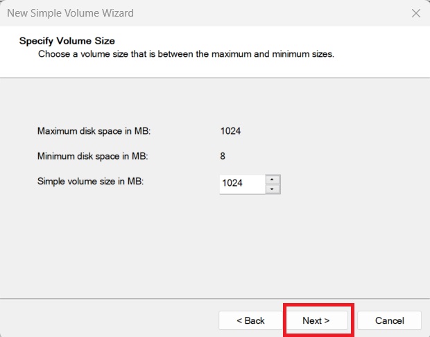 Right-click the Unallocated Space and select New Simple Volume.