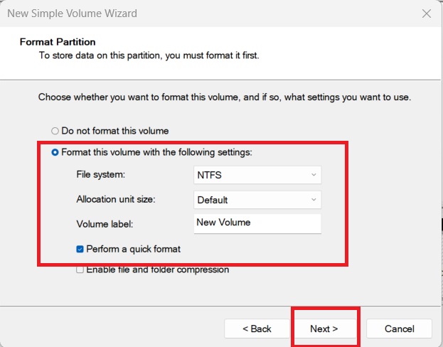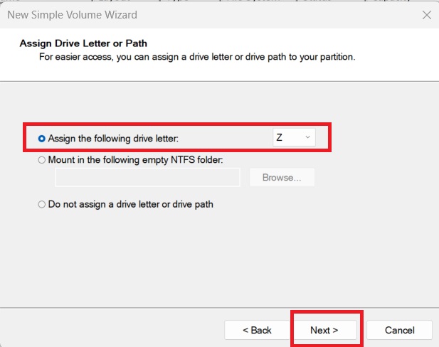Click Next, assign a drive letter, format the volume (choose NTFS), and click Finish.